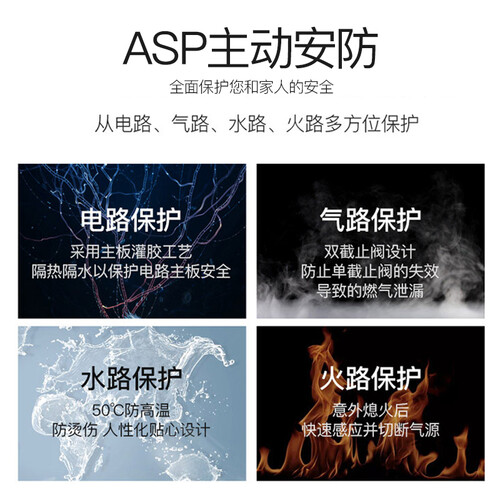 0.01pa极低水压也能正常启动,使用于高层用户等特殊环境;asp主动安防技术,在水,火,电方面全方位保护您的安全。