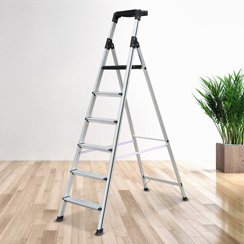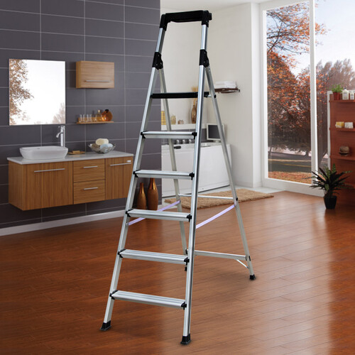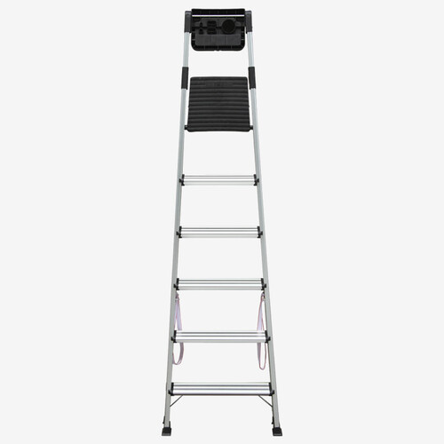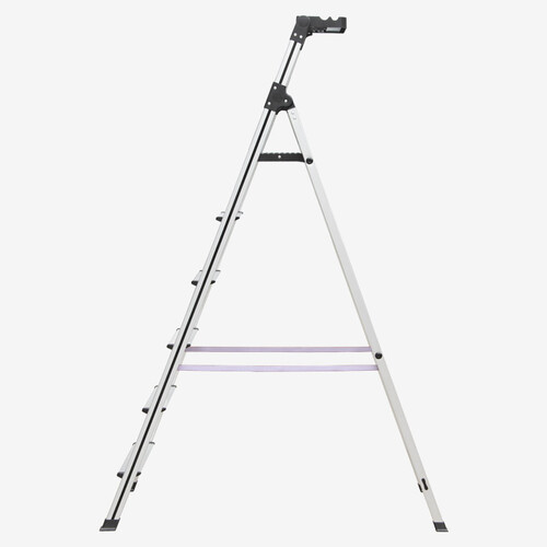 顶部设有可旋转的工具台,收纳灵活,登高作业一人即可轻松完成。配备马蹄橡胶脚套,防滑性好,不易伤地板。