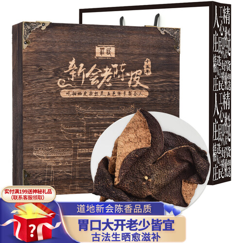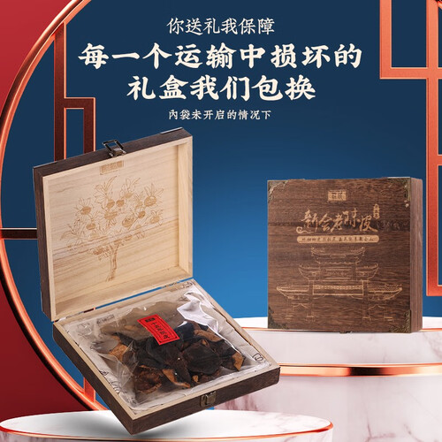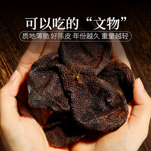 三瓣相连厚薄均匀,陈香浓郁泡茶清香。采用新会陈皮炮制工艺,柑皮分明完整。