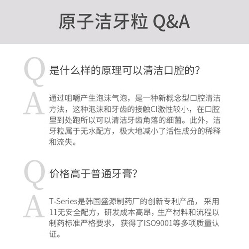 含有绿茶提取物,平衡口腔的PH值,呵护口腔健康。采用固体颗粒状,遇水即溶泡沫充盈,方便出门携带。