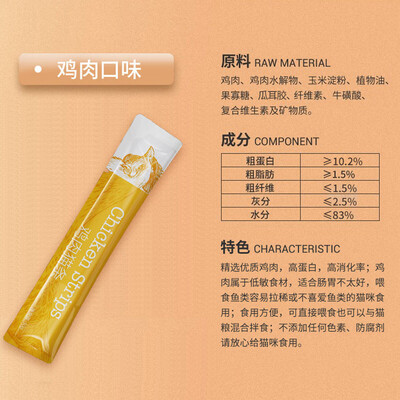 甄选上等鸡肉与鱼肉,经过高温蒸煮,成就有肉有水的肉泥,富含优量水平蛋白质,补足猫咪成长所需营养。不含诱食剂等添加剂,吃得放心。