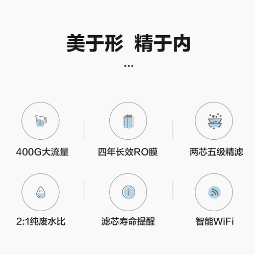 400G大容量,出水速度快,减少等待时间。搭载PCU4合1滤芯,更好去除水中微生物等,改善饮用水口感。