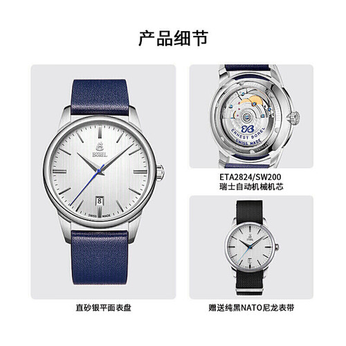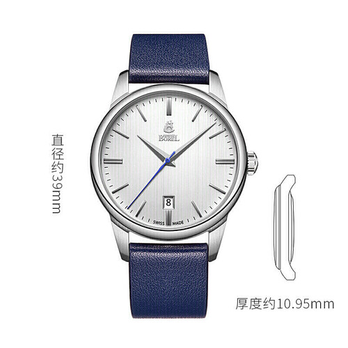 采用圆盘三针计时设计,皓银色表盘层次饱满丰富,读取时间更方便。表带选用优质皮质材料,触感温润舒适,佩戴时间更久。