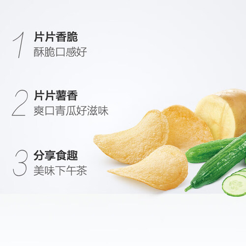 优选上乘马铃薯,薯香浓郁诱人,经过原薯鲜切技术,片片薄脆,咔兹一声快乐美味。爽口青瓜味,清香好闻不油腻。