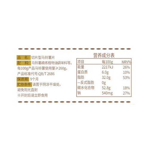 可比克 纯切香脆薯片