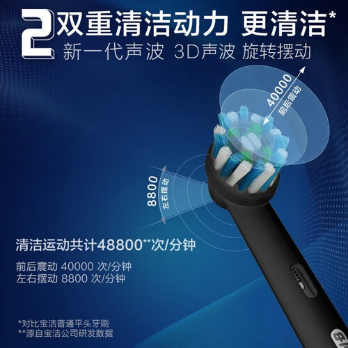 双重清洁动力,声波击碎牙渍,清洁力更强牙齿更亮洁清新。机身防水设计,无惧刷牙遇水问题,使用寿命长久。
