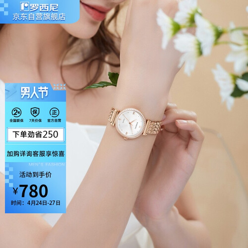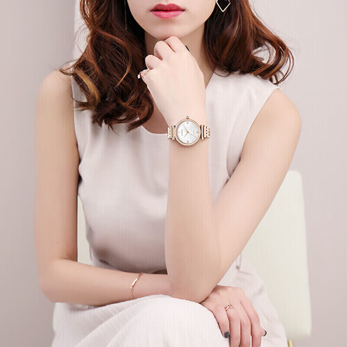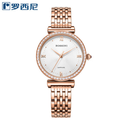 表圈的闪耀镶嵌元素,凸显出轻奢的美感,加入罗马数字刻度,具有复古的气息。手表采用弹簧扣开合的设计,省心方便。