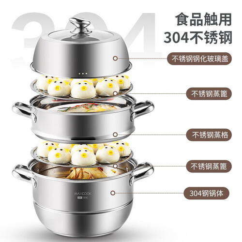 采用食品接触级不锈钢,可以放心使用,而且锅体更加牢固耐用。三层设计,上蒸下煮同时进行,大大缩短了做饭的时间。