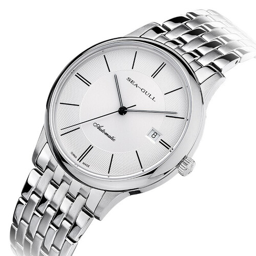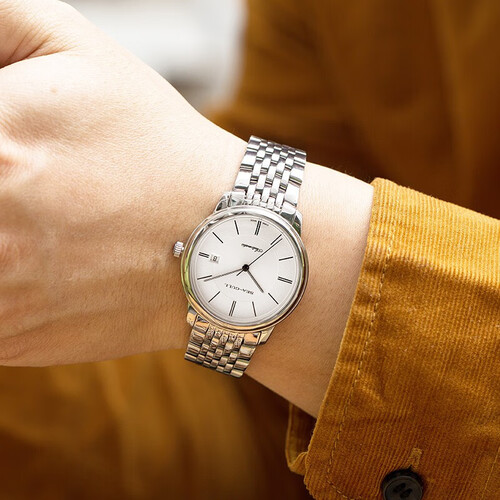 简约的表盘设计有一种简明清晰的既视感,精钢表带质地非凡,明朗大针设计利落,透底底盖,彰显机械表的魅力。