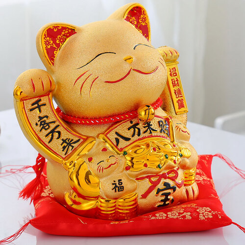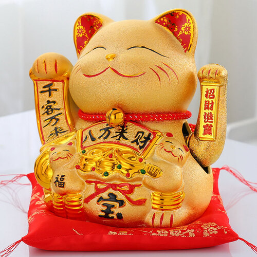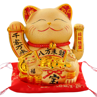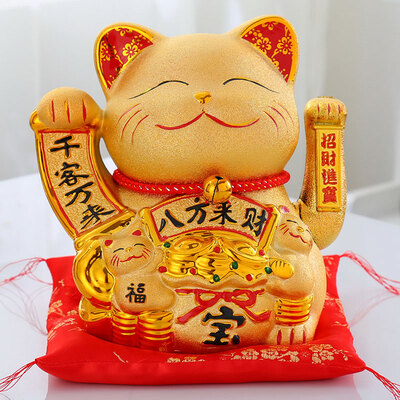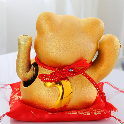 肥肥又可爱的小胖猫,胸前依偎着两只抓着立体元宝的小猫,寓意着守财;猫身金灿灿的,光滑均匀,安装电池后,双手就可摆动哦。