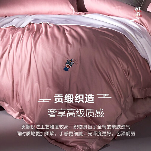 采用纯棉材质制作的四件套,经过贡锻织造工艺,使其更柔润细滑。搭配国潮刺绣图案点缀,美观更显潮流时尚。