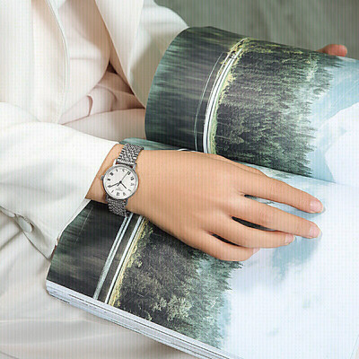 简约的表带,明朗大方的轮廓,加上皓银色调,如同月光般明亮闪耀,典雅的外观设计,彰显女士的大方优雅。