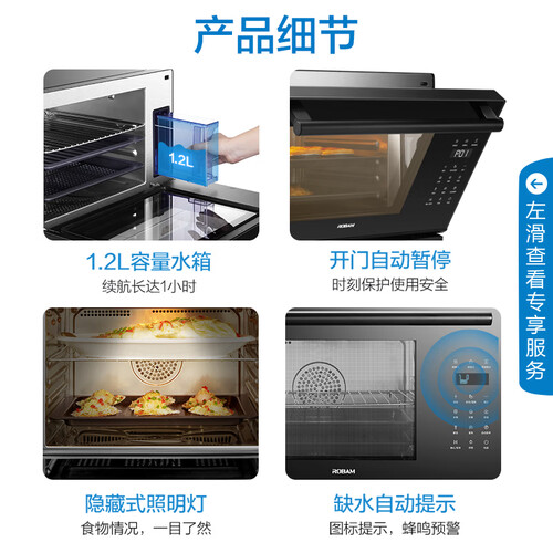 有营养纯炖,焦香脆烤,蒸汽嫩烤3大烹饪模式,适合海鲜肉类甜点红薯等各种食材。宽广域温区,多个温区选择,满足挑剔味蕾。