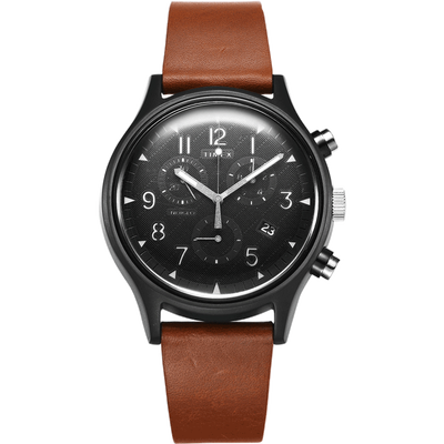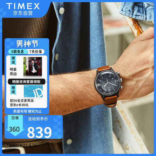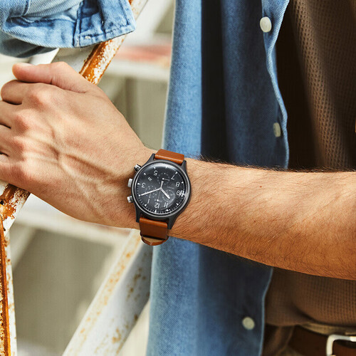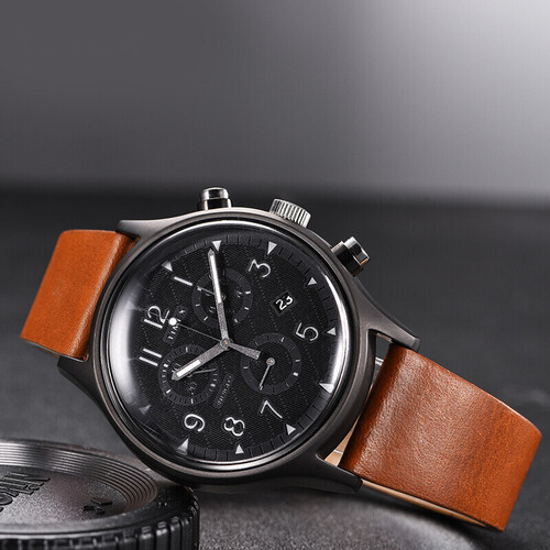 腕表镜面采用亚克力塑料材质,与平常材质不同,观感更通透清晰。搭配深卡其色皮质表带,佩戴更显美式型男质感。