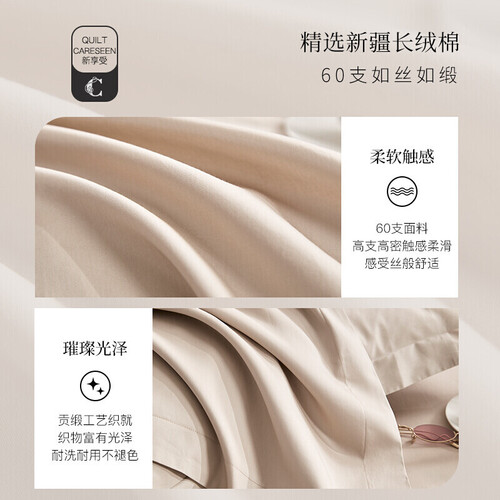 采用贡缎工艺织就,被面更具柔润光泽,凸显轻奢质感。甄选60支面料,触感柔滑细腻,给予舒适睡眠体验。