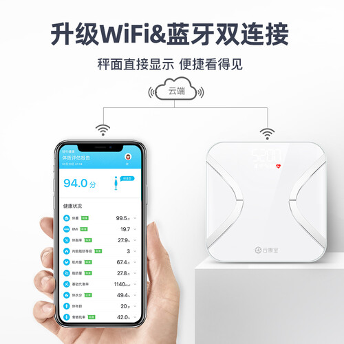 连接众多健身APP,瘦身技巧一手掌握,还能直接同步测量数据;两位小数精准显示,感知身体变化,支持多人使用,上秤自动识别。