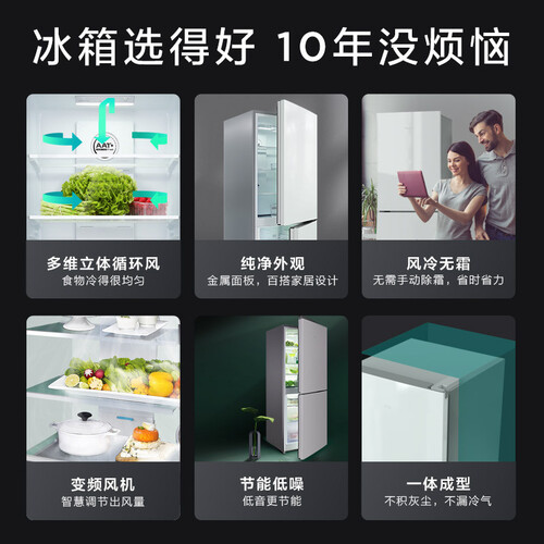 内智感温雷达,准确感知和调整温度,赋予不同食材更准确的呵护。风冷无霜科技,智能分配冷量,告别手动除霜的麻烦。
