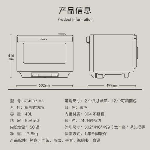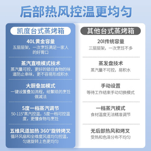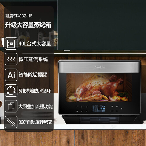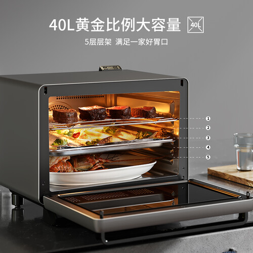 快速加热,烹饪更简单。集蒸、烤于一体的电烤箱,满足多种烹饪需求。50道预设菜单,烹饪就是如此简单。40L超大容量,聚餐轻松搞定。