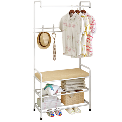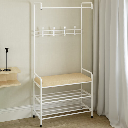 底部隔离地面设计,有效防止衣物受潮,且方便日常打扫清理。配备麻质坐垫,便于置物和坐下休息,贴心实用。