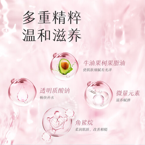 含有微量元素、角鲨烷以及透明质酸钠,持续不断给予皮肤足够的水分,赋予肌肤弹性和活力,有效缓解肌肤粗糙。