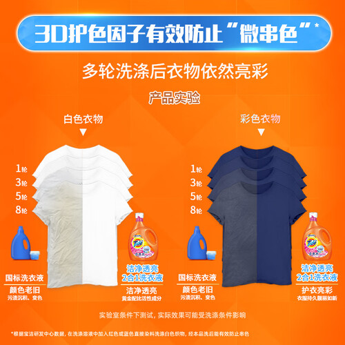 添加了3D护色因子,能直接鉴别衣服上的染色粒子,从而更好保护各类衣物的本来色泽;可深入内部溶解顽固污垢,彻底清除不留痕。