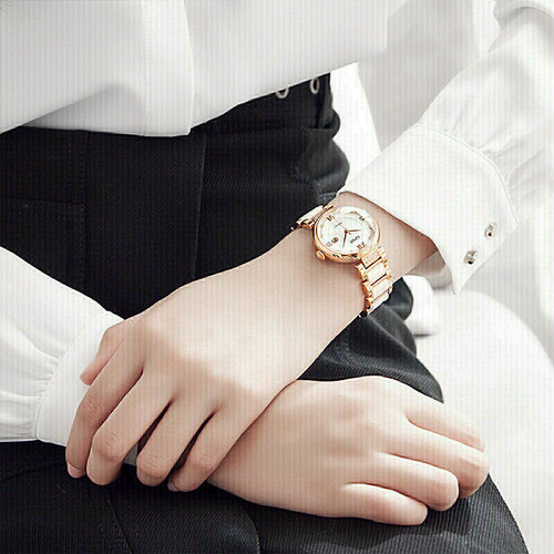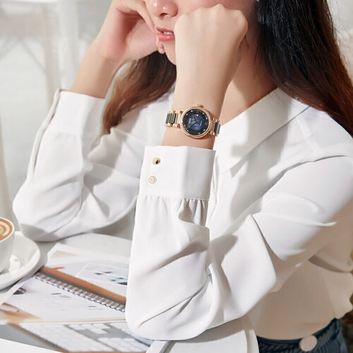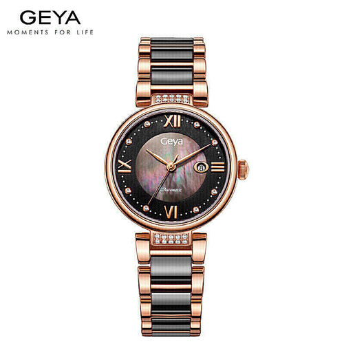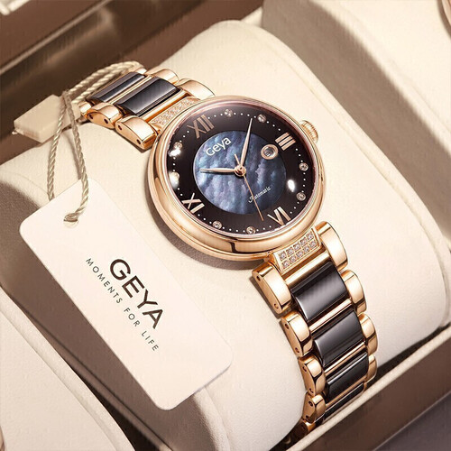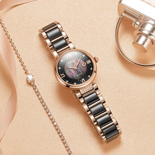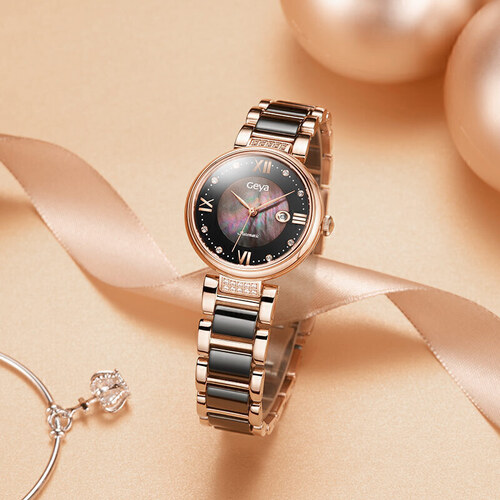 珍珠贝母盘面与黑色搭配,个性独特,色泽更加绚丽多彩。黑金色搭配表带,轻奢大气,打造与众不同的时尚氛围。