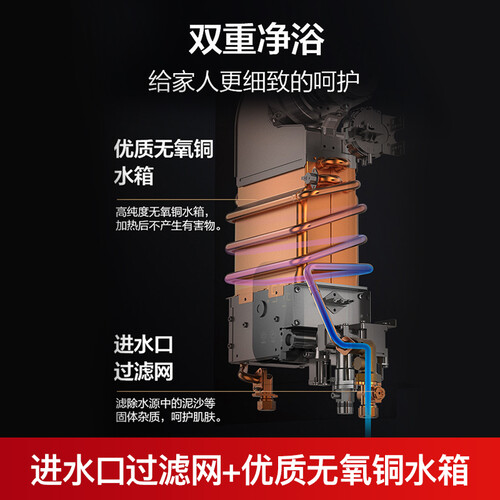 内部水箱采用无氧铜水箱,抑制细菌生长,加强导热性能;智能防冻科技,延长使用寿命,即使在零下的极端环境依然正常运行。