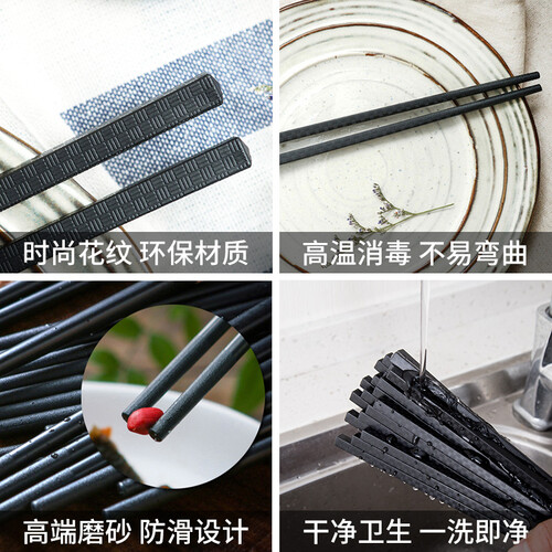 筷身呈哑光质感,简约美观,不容易附着脏污,洁净卫生,体验舒适。选用硬度高的合金材质,抗压性能好,不容易变形。