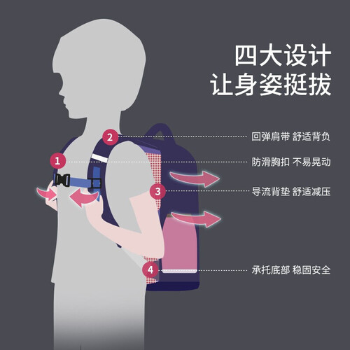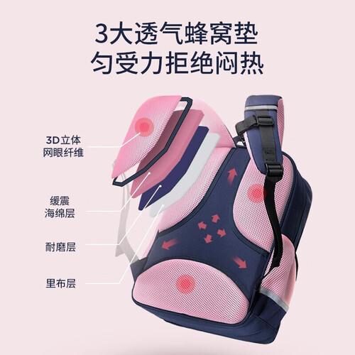 采用了科学分散压力设计,减少了学生的负担,让其背着更舒适。采用3大透气蜂窝垫,减少背负闷热感,透气舒适不易闷汗。