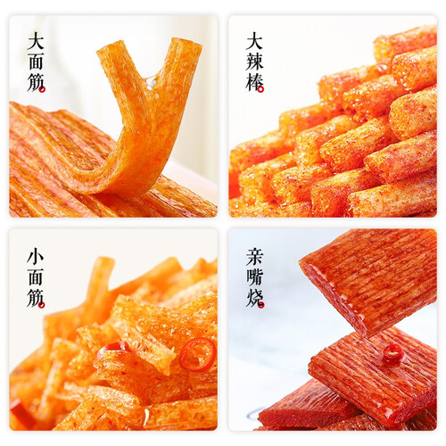 辣条包括大小面筋不同品种,滋味厚重,嚼劲十足,依旧是小时候的味道。辣中带甜的口感,让人回味无穷,吃完指尖留香。