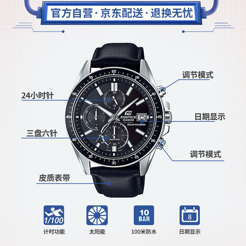 太阳能功能设计,有光就可以为手表提供动力,不需要频繁更换电池。100米防水的功能很实用,日常游泳也可以佩戴。