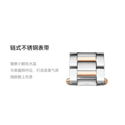 矿物水晶表镜,透光性好,清晰透亮,不易磨损刮花,经久耐用。链式不锈钢表带,搭配蝴蝶表扣,方便摘取佩戴。