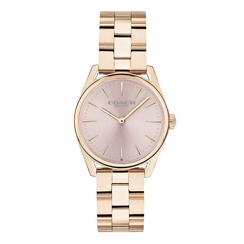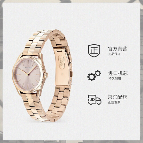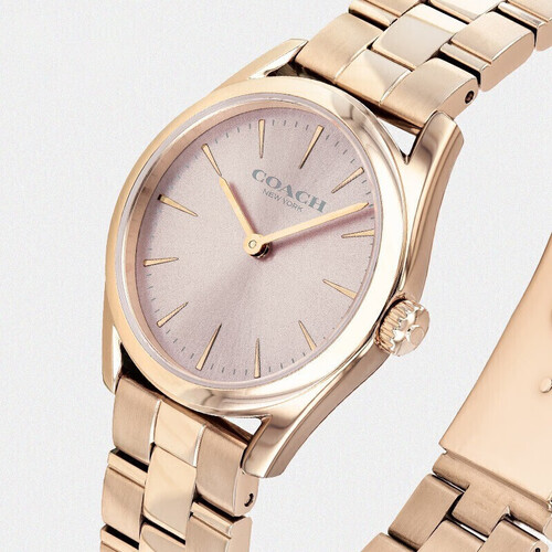 粉色日辉纹表盘配以利落指针,时尚别致有质感,搭配金色链式表带,时尚质感满分。矿物水晶表镜,通透清晰,便于日常读表。