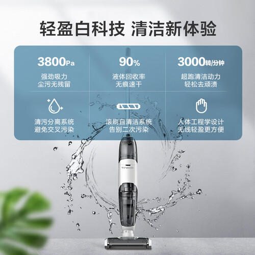 无线设计,摆脱线缆舒适,自由灵活使用,不受场景限制。3800Pa强劲吸力,干湿垃圾清理不费时。