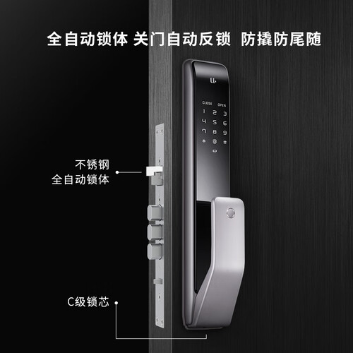 指纹识别自动开锁,无需按压把手,轻轻一碰即可开门回家。采用全自动锁体,关门自动反锁,不怕别人尾随你。