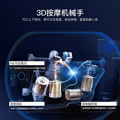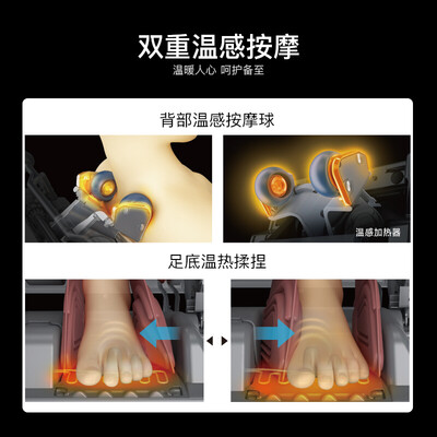 内置3D立体按摩机芯,为你带来仿人手般的按摩手法,深层缓解全身疲劳。双重温感按摩,温暖呵护关节,暖暖的更舒适。