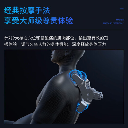 采用按摩椅专用皮革,不仅更耐磨也更亲肤透气。搭配智能3D机芯,可自动贴合人体曲线,力度自由调节更舒适。