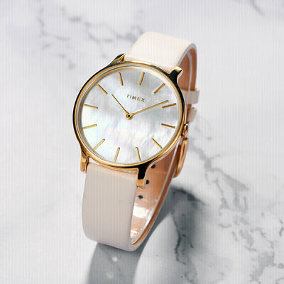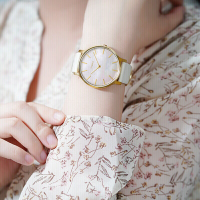 贝母材质的表面,光泽度好,简约的指针设计,凸显纯粹气质。浅色系优质皮料选材,耐磨不易变形,美观实用。