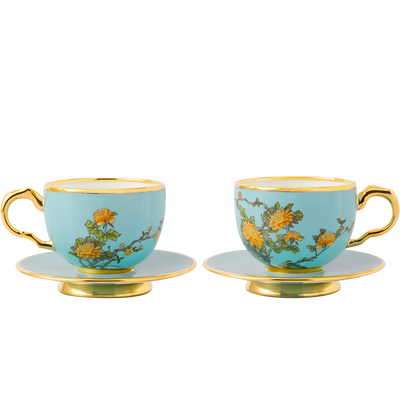 这款咖啡杯采用了对杯的设计,很适合情侣之间馈赠。西湖蓝色的色调,加入了花朵图案,诠释复古优雅气息。
