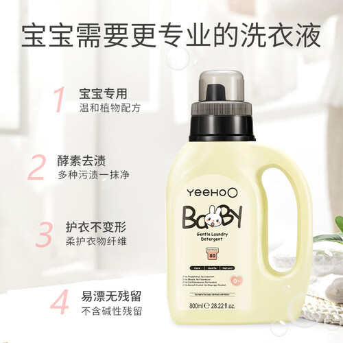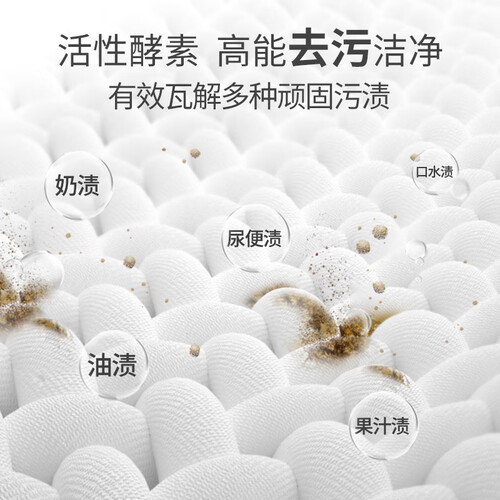 安全无添加,不含荧光剂、色素和漂白剂等化学成分,宝宝衣物清洁安全放心。采用植物酵素配方,去污力更强,奶渍等都能洁净。