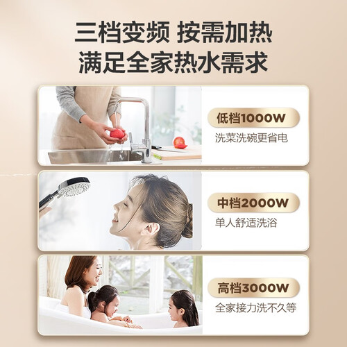 采用新一代金刚无缝内胆,结合高密度搪瓷涂层设计,无惧酸碱水质,有限延长使用寿命。3000W变频速热,性能更强劲。