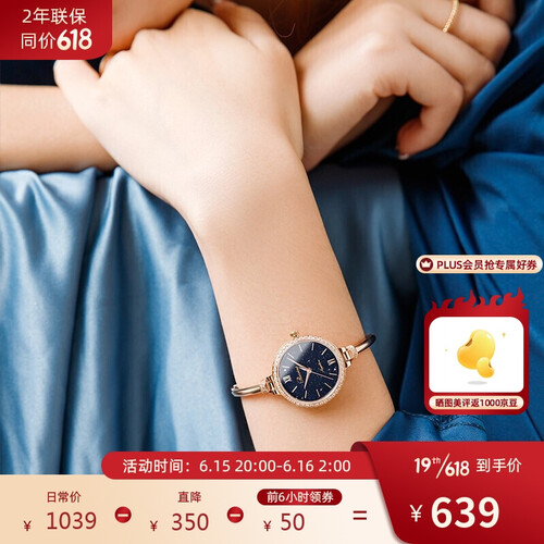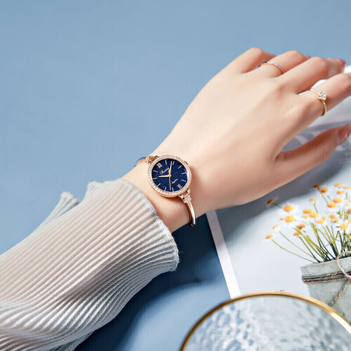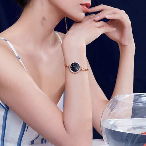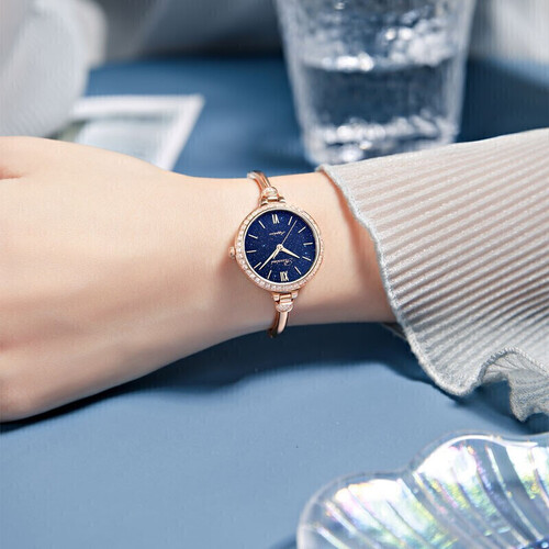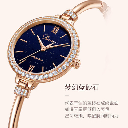 手表表盘以蓝砂石为底面,好像星空秘境静谧而璀璨,手镯式表带设计非常百搭,日常佩戴或者约会佩戴都非常合适。