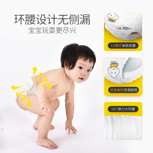 采用双核芯科技差速吸液,高效导流,让宝宝随时干爽透气。同时360度弹力大环腰,具有弹性,不会勒到宝宝的小肚子。