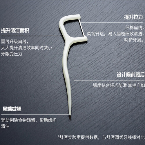 细扁线设计,拉力强耐磨损,方便清洁牙缝。高弹性棒柄,多角度洁牙。