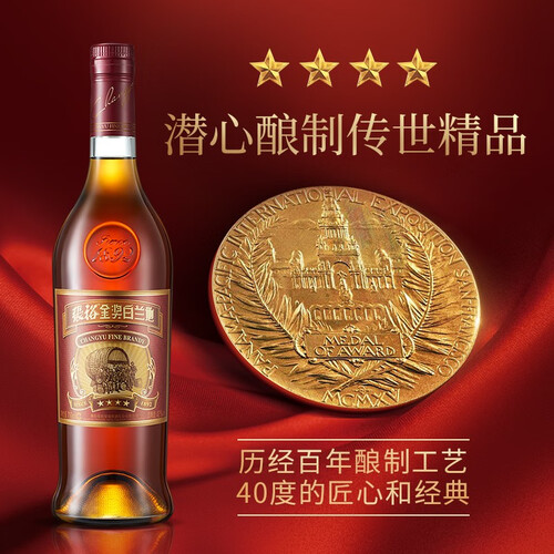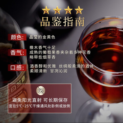 张裕四星金奖白兰地葡萄酒,源于山东烟台北纬37.5°葡萄产区。酒液呈琥珀色,黑铜与少许红褐色交织。