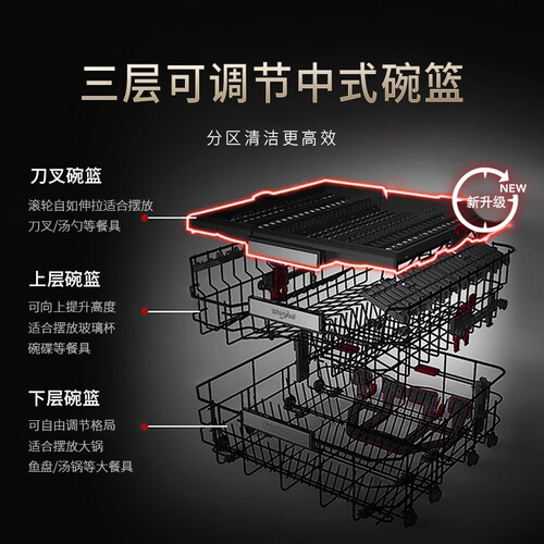 四层增加喷淋设计搭配上可立式锅架,360度全面清洁需要清洗的餐具。第6感智能清洗,根据检测餐具脏污程度,自动调节程序。