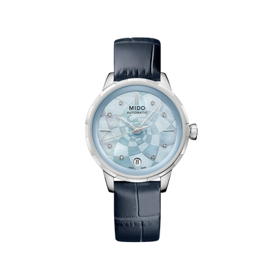 以新加坡艺术科学博物馆为灵感设计,蓝色的珍珠母贝表盘梦幻迷人,中间的莲花图案更显唯美,皮革表带佩戴倍感舒适。