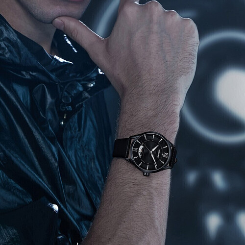 采用锋利的银针搭配黑表盘,指针棱角分明,尽显男士的干练。拥有夜光指针功能,不惧黑暗环境,轻松读时。