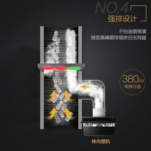 380Pa强劲风压,有效避免高峰期油烟倒灌的情况。近吸直排技术,低空净除油烟,打造清爽烹饪环境,不受油烟熏呛。