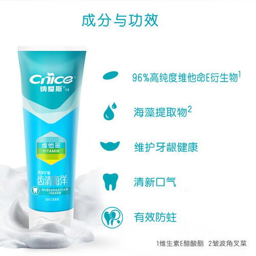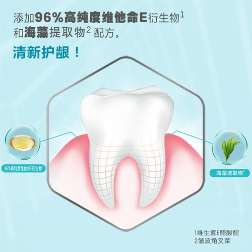 添加维生素E衍生物及海藻精华,清新口气,让你我更亲近。这款牙膏拥有固齿护龈功效,维护牙龈健康,让你吃喝更尽兴。